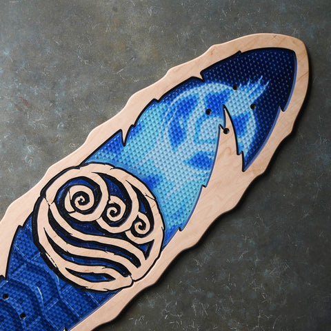 Each Blind Box contains one of eleven exclusive street deck designs. All four nations are represented with edition sizes of 1250 per design. The Water Tribe and Fire Nation have holographic variants that are an edition of 500 per design. Aang has an edition size of 750 with 250 holographic variants. The holographic KoiZilla is an edition size of 100, and finally, two lucky fans will pull the coveted one-of-one Moon Spirit and Ocean Spirit Decks. Every deck comes with a numbered Certificate of Authenticity.