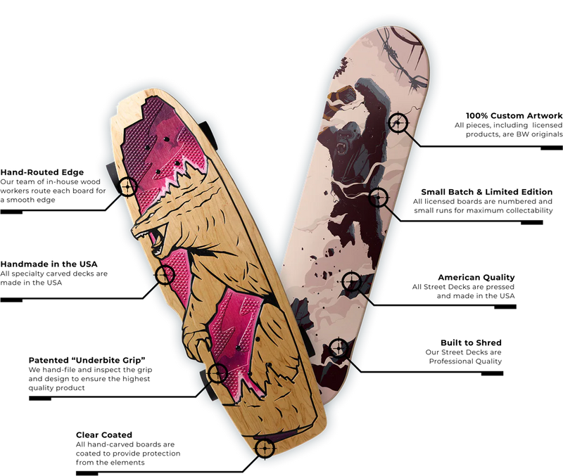Carved board includes custom Bear Walker x Godzilla wheels.