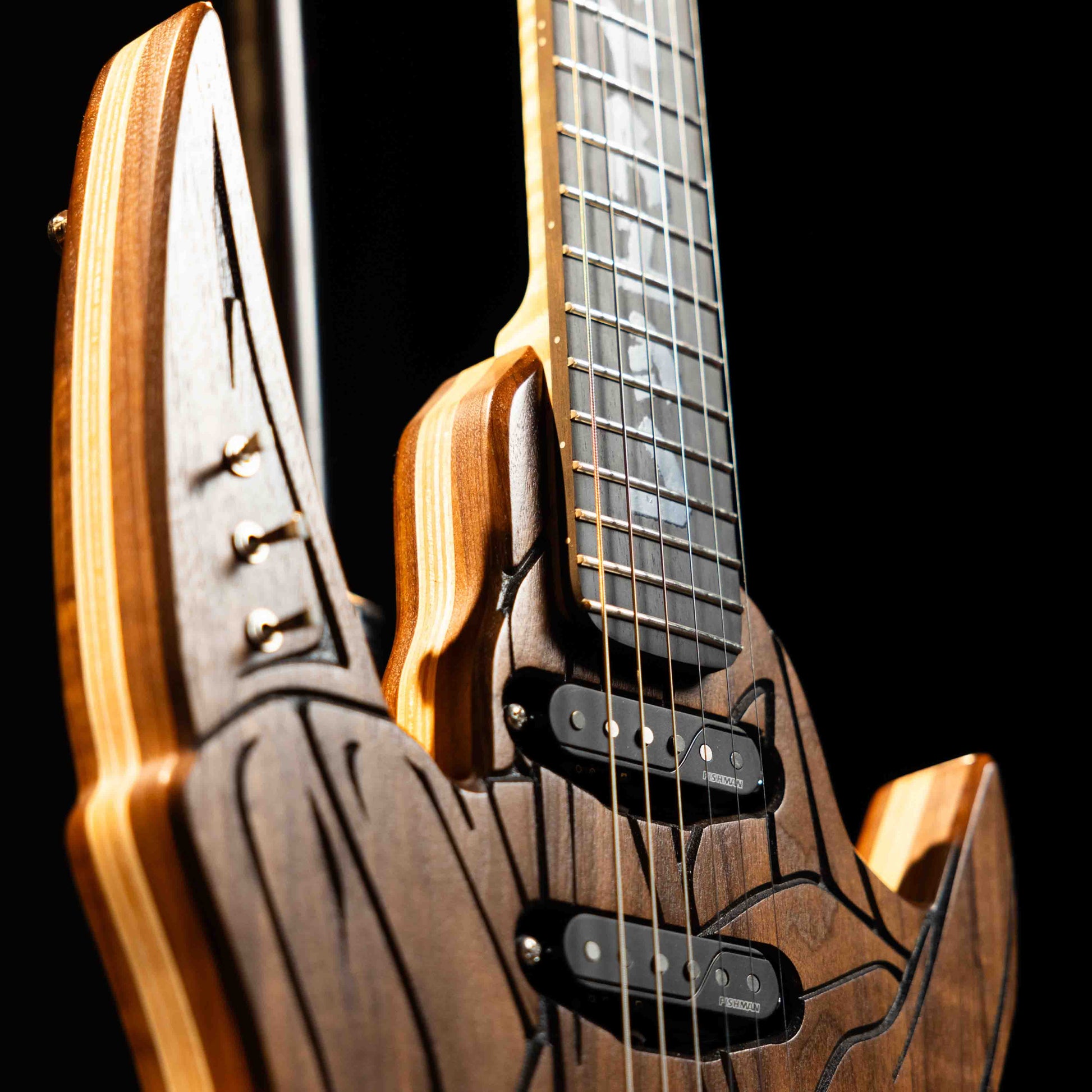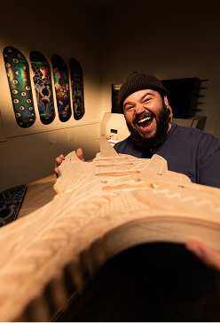 Salvaged skateboard decks are laminated and used as top veneers or accent inlays, giving each guitar a visually striking and one-of-a-kind aesthetic.