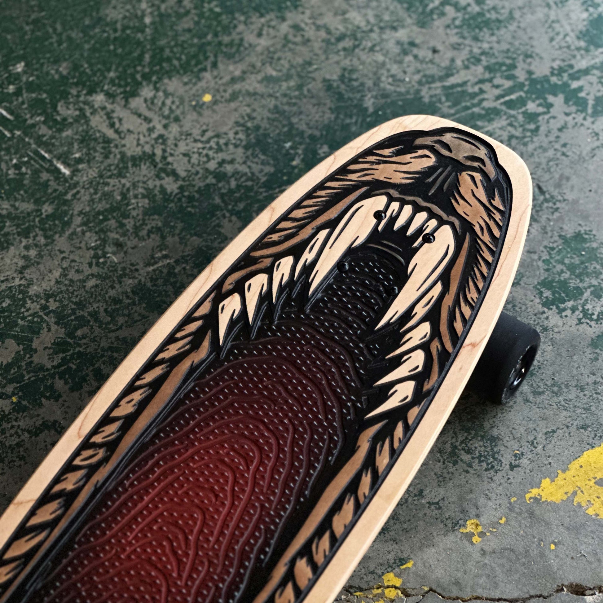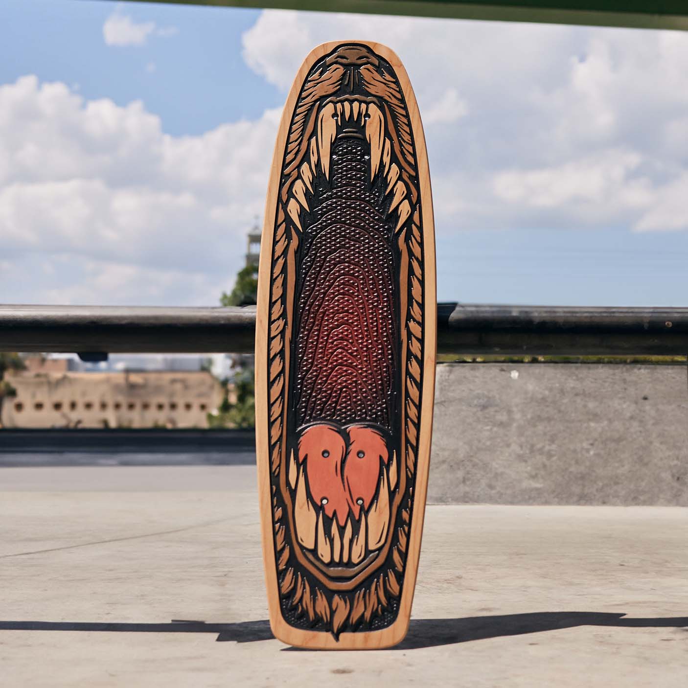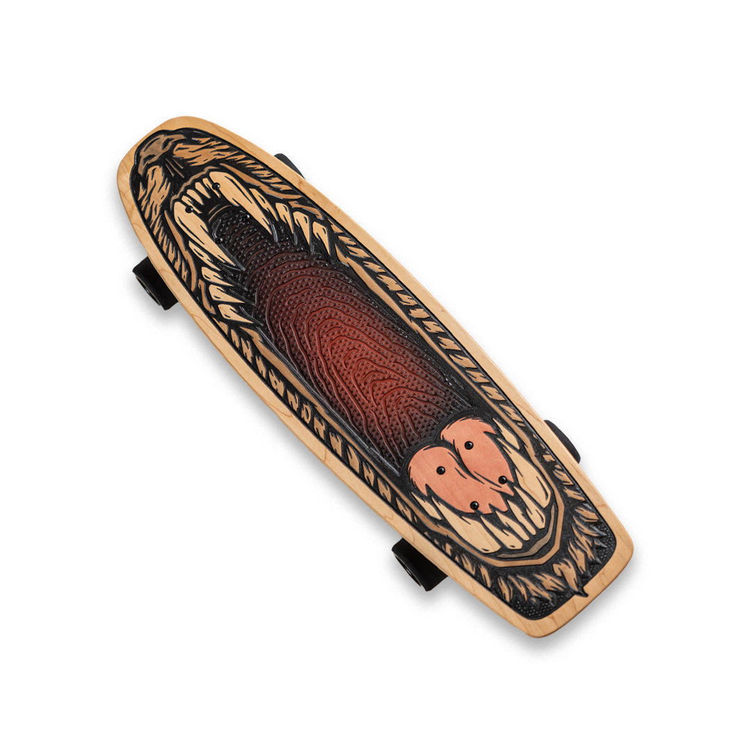 An official Bear Walker cruiser deck. This board is handcrafted using cutting-edge technology and old-school woodworking techniques. The design features a retro design on top of our patented Underbite grip. This is a natural product, so wood grain may vary.