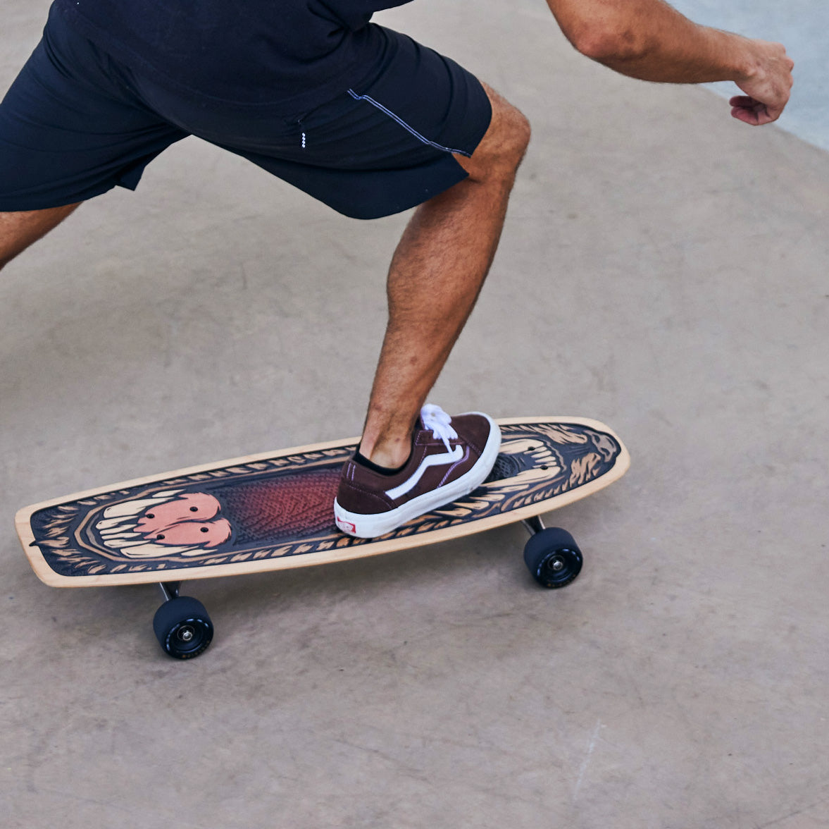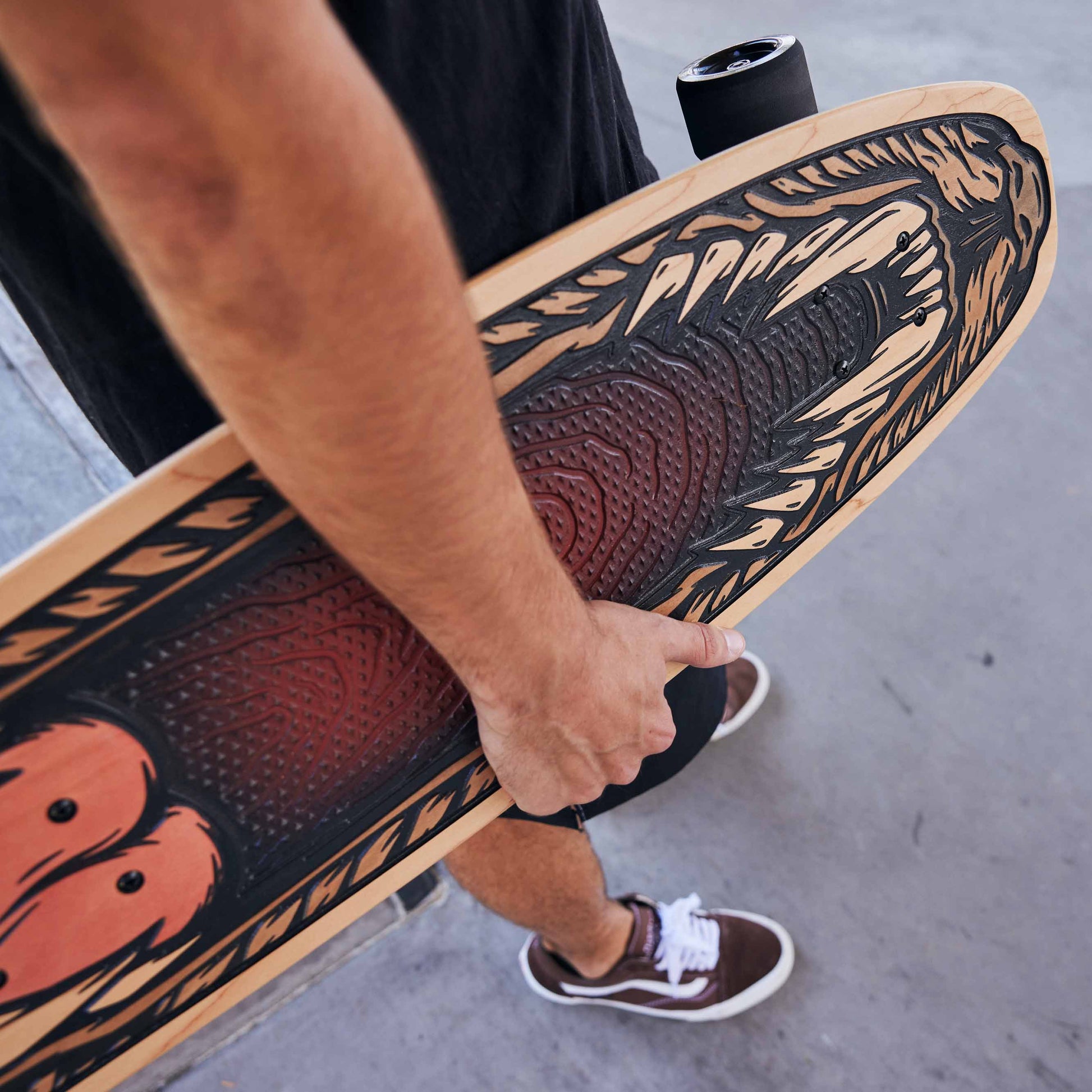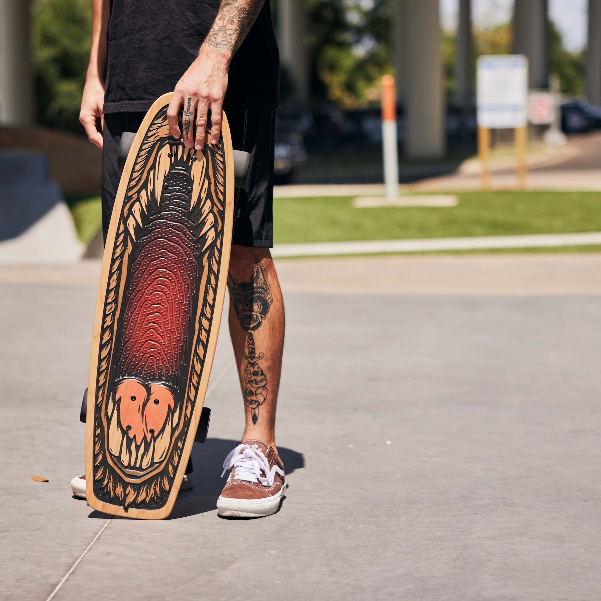 An official Bear Walker cruiser deck. This board is handcrafted using cutting-edge technology and old-school woodworking techniques. The design features a retro design on top of our patented Underbite grip. This is a natural product, so wood grain may vary.