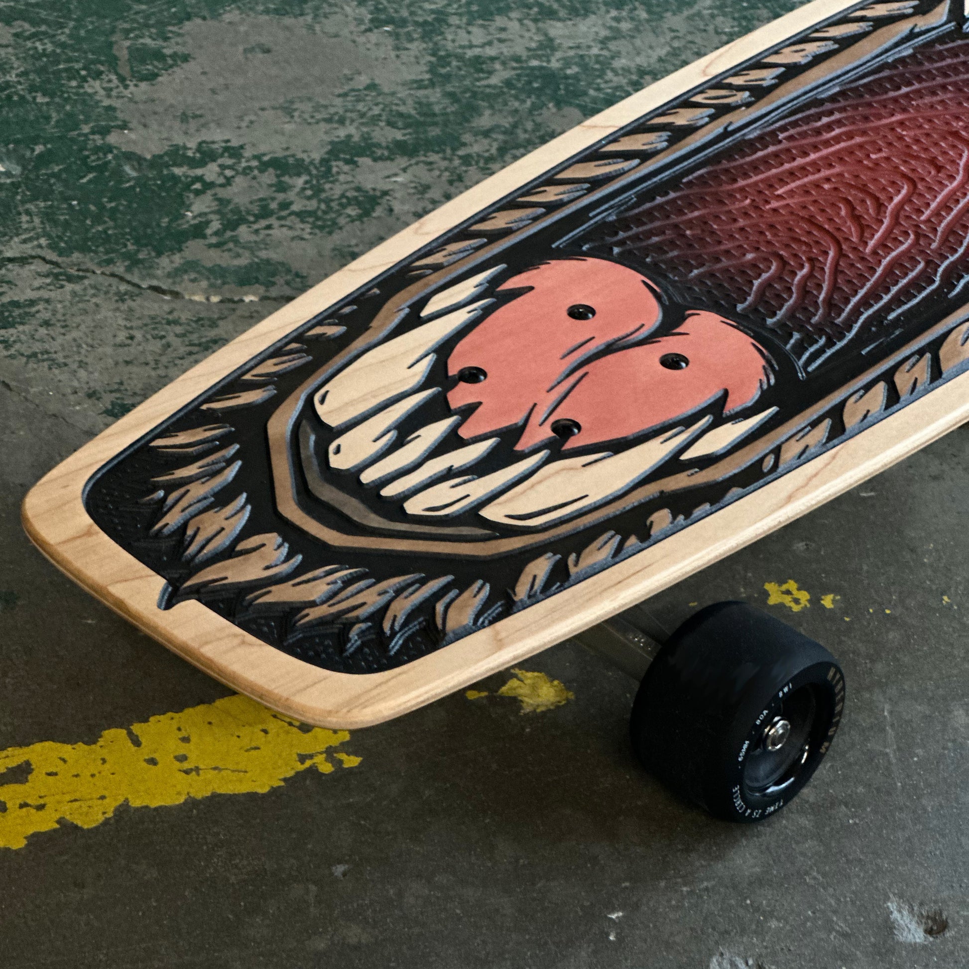 We custom-mill the grip pattern into our signature carved and complete cruiser decks. This makes the grip of your board more durable and stronger than traditional grip tape. For our street decks we have Jessup grip tape with multiple designs to choose from.